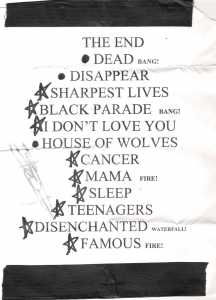 El inicio de ese concierto fue fenomenal: el telón se abría y aparecía Gerard Way sobre una camilla de hospital, una escena un tanto tétrica, y “The End” comenzaba a sonar; posteriormente y como parte del show, el cantante queda con el uniforme usual que caracteriza a la banda.